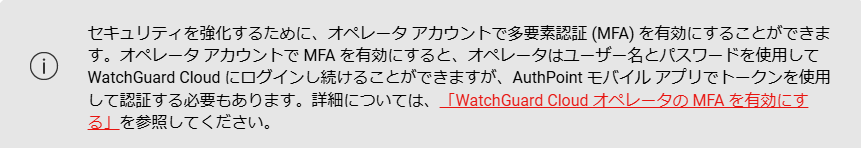 WatchGuard Cloud オペレータの MFA を有効にする デフォルトでは、オペレータはWatchGuard Cloudにログインする際、認証にパスワードを使用します。 セキュリティを強化するために、オペレータアカウントで多要素認証(MFA)を有効にすることが できます。WatchGuard Cloudは、WatchGuardの多要素認証サービスであるAuthPointをMFAに使用します。 ...