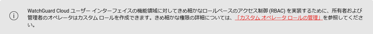 [ロール] ページでは、組み込みロールに基づいてカスタム ロールを作成できます。WatchGuard Cloud のさまざまな