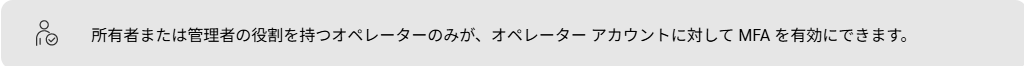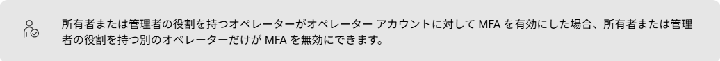 ・アカウント レベルの MFA が有効になっている場合、所有者または管理者の役割を持つオペレーターだけが自分の