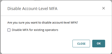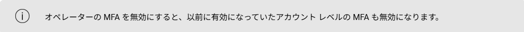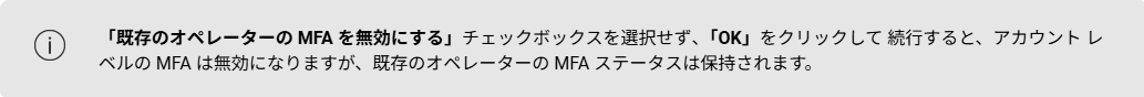 アカウント レベルの MFA を無効にすると、既存のすべてのオペレーターの MFA も無効にすることができます。