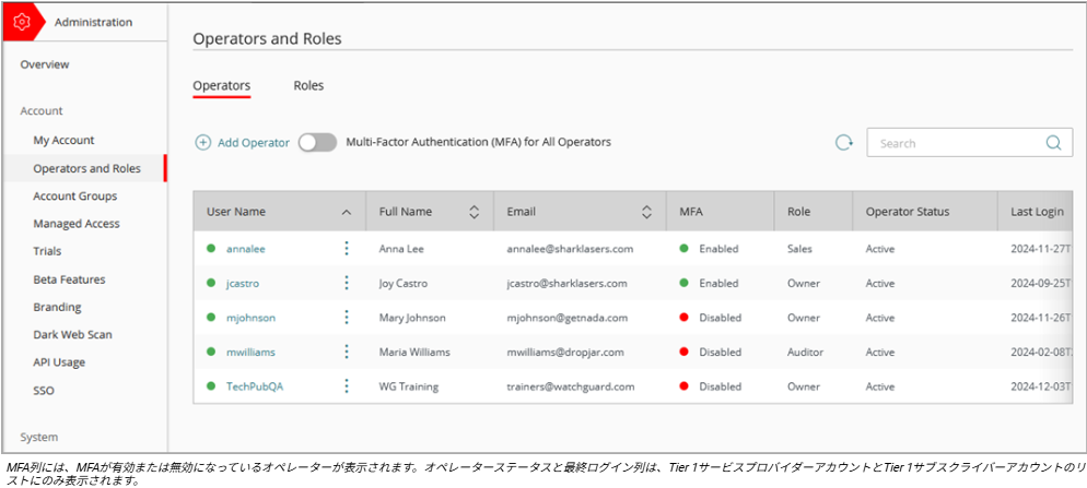 MFA列には、MFAが有効または無効になっているオペレーターが表示されます。オペレーターステータスと