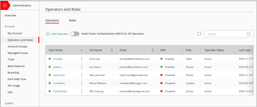 アカウントレベルでMFAを有効にすると、WatchGuardはアカウント内のすべてのオペレータに対してMFAを有効にし、